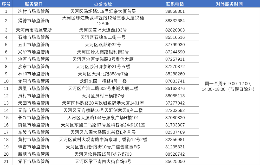 天河区个体工商户经营者可前往属地市场监管所办理,无需预约。各市场监管所地址及咨询电话,请见下表: